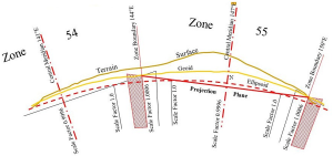 در قسمت مياني زون، نقاط قرمز (UTM) ونظيرشان نقاط Local UTM) X ) هستند. هر چه از نقطه Fix دورتر شويم فاصلهء بين نقاط قرمز و X (نظير) بيشتر مي شود. بلعكس، در صورتيكه منطقهء عملياتي در “طرفين بيروني” زون باشد. مختصاتهاي Local در امتدادهاي شعاعي به نقطهءFix نزديك مي شوند (نقاط X ) و هر چه خود نقـاط UTM (نقـاط قرمـز) از نقطـهءFix دورتر باشند، فاصلهء بين نقاط قرمز و X افزايش بيشتري دارد.
