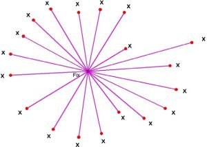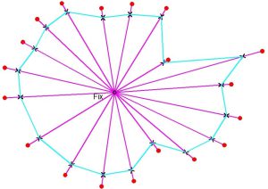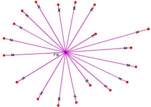 بدين ترتيب پس از توليد مختصات Local UTM طول كليه نقاط نـسبت بـه ايـن نقطـه Fix، بـصورت شعاعي، با طول زميني برابر خواهد بود. در صورتيكه منطقه عملياتي در “قسمت ميـاني” زون باشـد(نقاط قرمز ) مختصاتهای Local در امتداد هاي شعاعي از نقطه Fix فاصله مي گيرند (نقاط X ) و هر چه خـود نقاط UTM (نقاط قرمز) از نقطهء Fix دورتر باشند، فاصلهء بين نقاط قرمز و X افزايش بيشتري دارد.