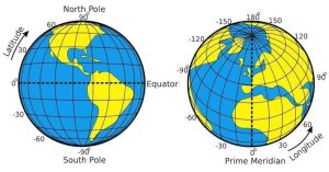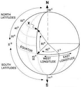 در سیستم مختصات کروی، خطوط افقی یا همان شرقی غربی که همان مدارها می باشند نمایانگرعرض جغرافیایی و خطوط عمودی یا همان شمالی جنوبی که همان نصف النهارها می باشند، نمایانگر طول جغرافیایی می باشند مدار میانی بین دو قطب استوا نامیده می شود که مبدأ عرضهای جغرافیایی محسوب می شود. مبدأ طولهای جغرافیایی نیز نصف النهار عبوری از شهرگرینویچ انگلستان می باشد که دربعضی کشورها از نصف النهار برن، بوگوتا و یا پاریس استفاده می شود.