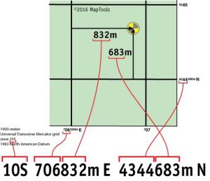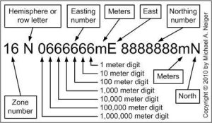 10S مشخص کننده ناحیه اي است که شما در آن قرار دارید . این تقسیم بندي باید به گونه اي خاص و یکتا باشد تا بتوان تمام نقاط کره زمین را با آن تقسیم بندي کرد. شماره نمایش داده شده در بالا 0559741 ، مشخص کننده مختصات شرقی ، غربی شما بر حسب متر در این ناحیه خاص می باشد که با نام شرقی خوانده می شود. شماره نمایش داده شده در پایین 4282182 یک مقدار بر حسب متر می باشد که نمایش دهنده مختصات شمالی جنوبی شما می باشد و در این حالت و این ناحیه ” شمالی ” نامیده می شود.