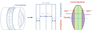 بديهي است در اين دو امتداد، طـول روي بيضوي، با طول روي استوانه، يكسان است (K=1) بدين ترتيب يك زون 6 درجه، به سه قـسمت تبـديل مـيشود، كه شامل يك قسمت مياني به عـرض حدودا 440KM روي اسـتوا و دو تـا “طـرفين بيرونـي” است.