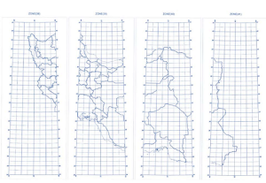 بر اساس شکل زیر نواحی ایران به 1200 منطقه در سیستم UTM تقسیم بندي می شود هر منطقه با یک عدد براي طول جغرافیایی و یک حرف براي عرض جغرافیایی نشان داده می شود.