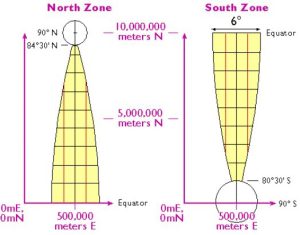 محور های این سیستم مختصات UTM را Easting محور ایکس و Northing محور ایگرگ هستند که بر روی مقادیر قراردادی بنا شده اند. در نیم کره ی شمالی خط استوا با نورثینگ صفر شروع میشود و در 84 درجه ی شمالی به 9334080 مترنورث ختم میشود )فاصله از استوا( برای سهولت در نیم کره ی جنوبی این مقدار به حای صفر از10000000 دارد ودر 80 درجه جنوبی به 1110400 متر نورث ختم می شود.